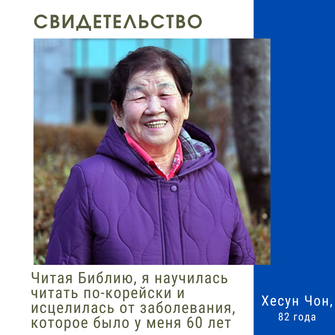 Поначалу это казалось непосильным. Но мой лидер округа поддержал меня и сказал: «Даже если медленно – обязательно читай». В послушании я начала читать – буква за буквой. И по Божьей благодати буквы начали складываться в слова, скорость чтения увеличивалась, а время, проведённое в Слове, постепенно стало радостью. Чем ближе я была к Слову Божьему, тем больше чувствовала, как меняются и исцеляются моё сердце и моё тело.